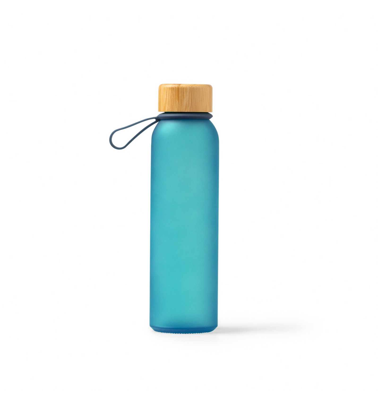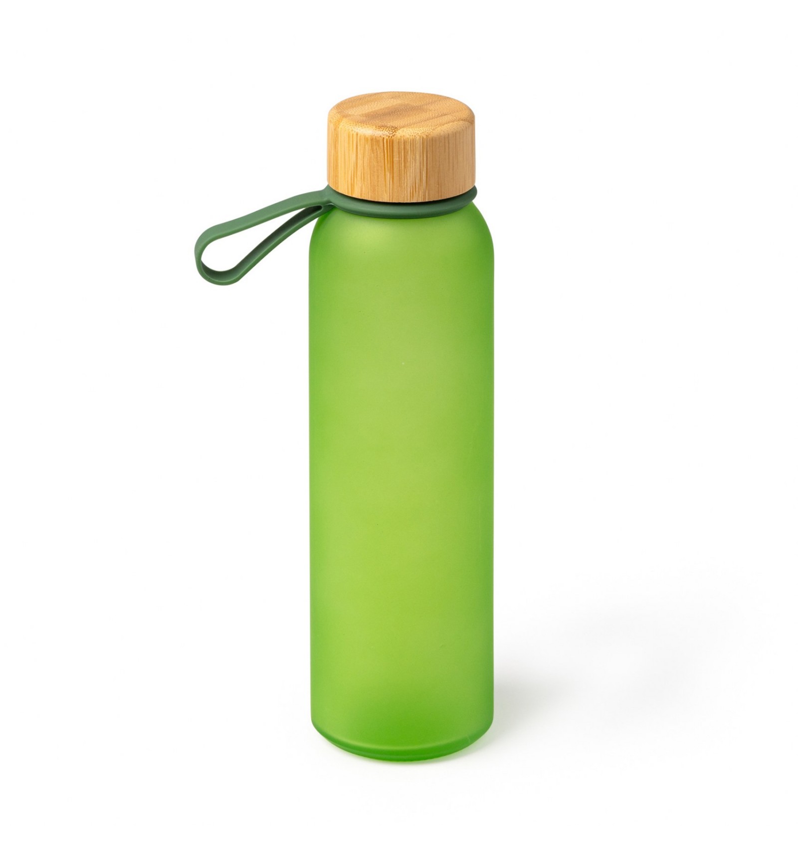 Bidon din sticlă reciclată translucidă. Are un capac cu șurub elegant din bambus și un mâner practic pentru transport.