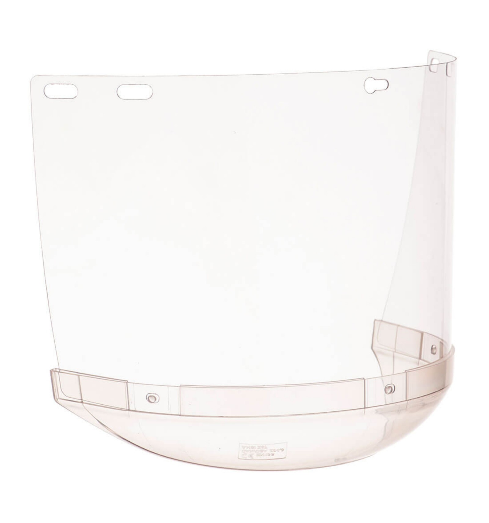 Vizor transparent din policarbonat cu grosimea de 1 mm, cu protecție pentru bărbie inclusa din ABS, ușor de atașat, pentru o protecție îmbunătățită a ochilor / feței. Compatibil cu suportul de la vizorul PS58.