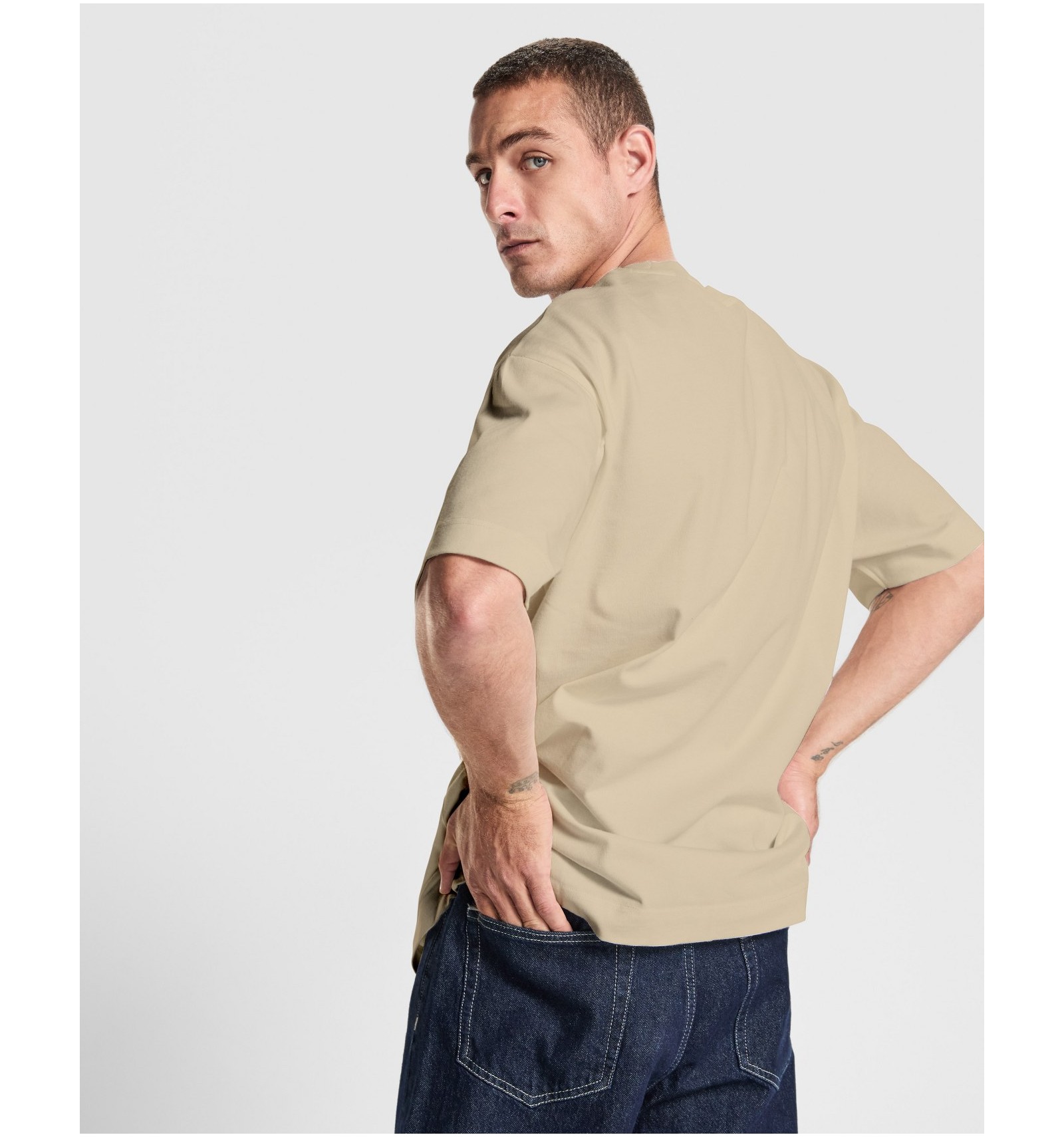 Tricou oversize gros cu mânecă scurtă. Guler rotund cu nervuri late 2x1.