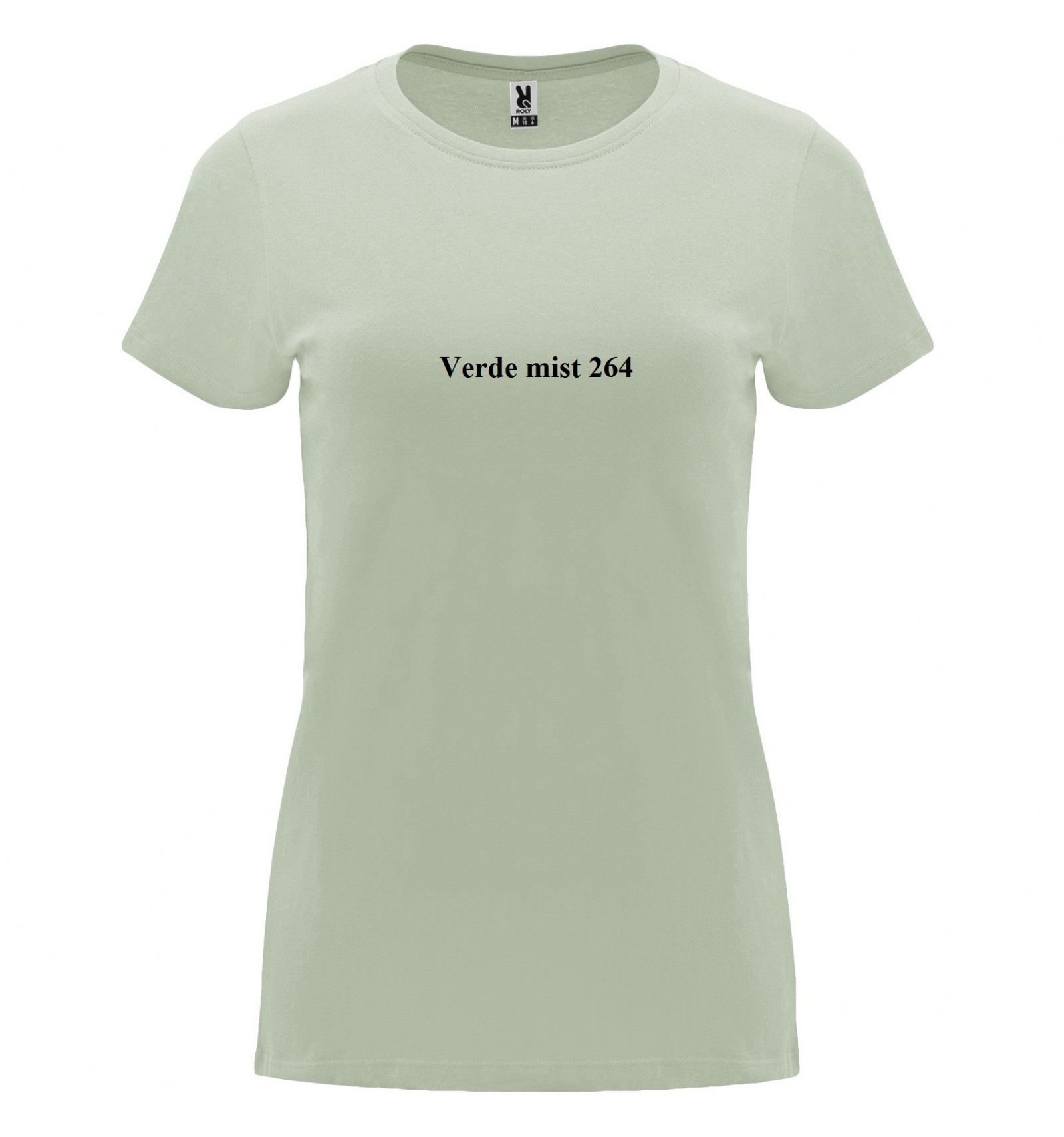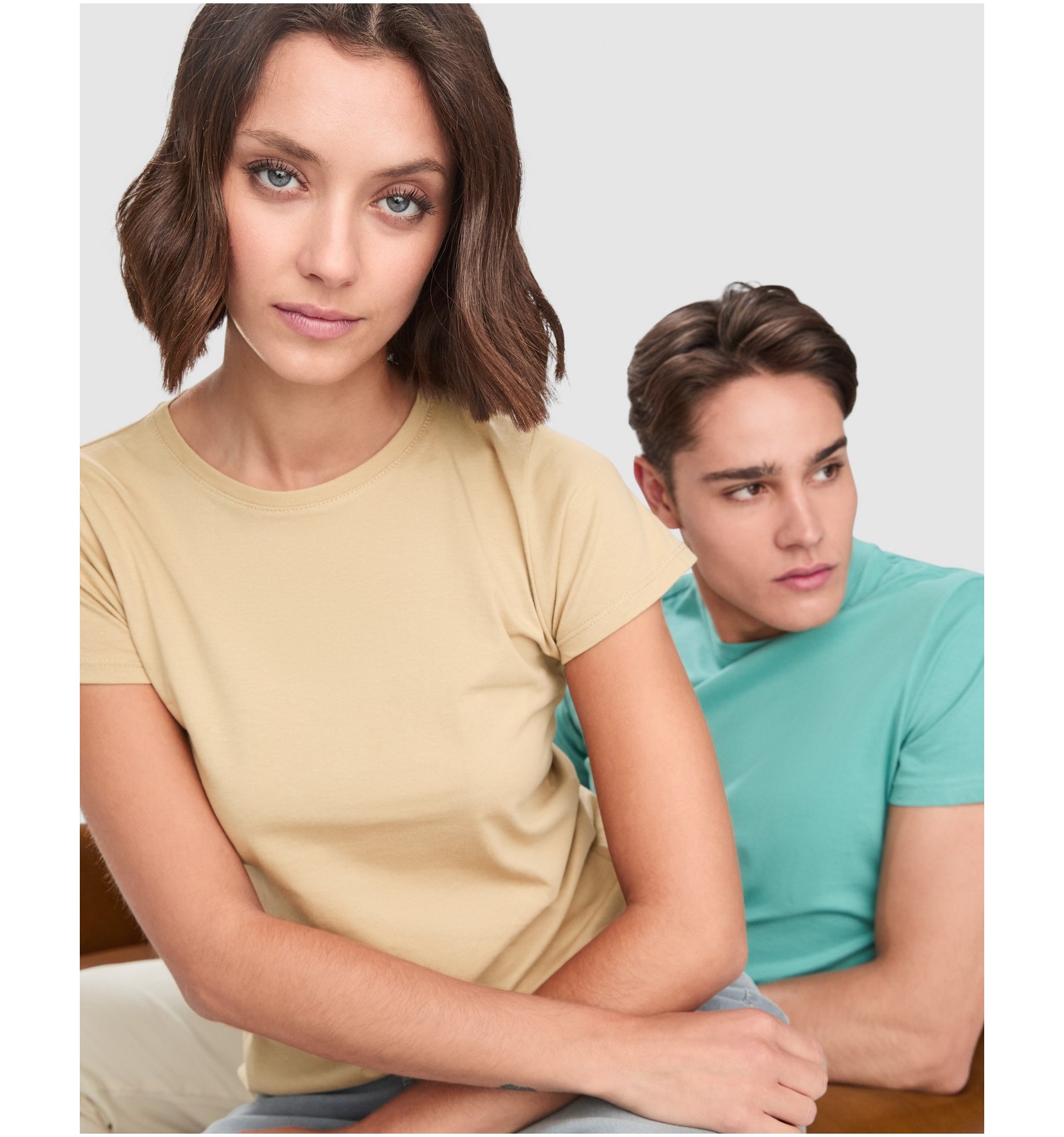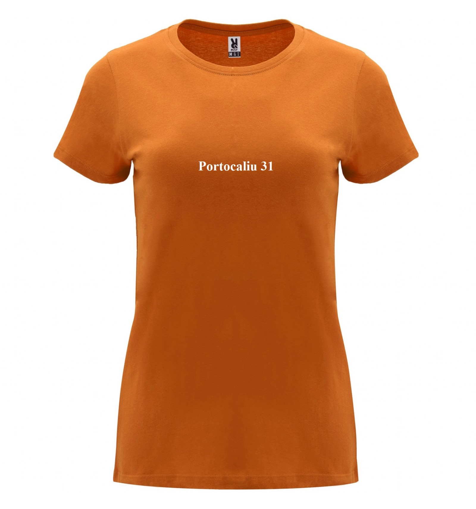 Tricou cu mânecă scurtă de damă. Guler rotund în canalé 1x1. Model cambrat. Bandă întărită pentru acoperirea cusăturilor la guler.