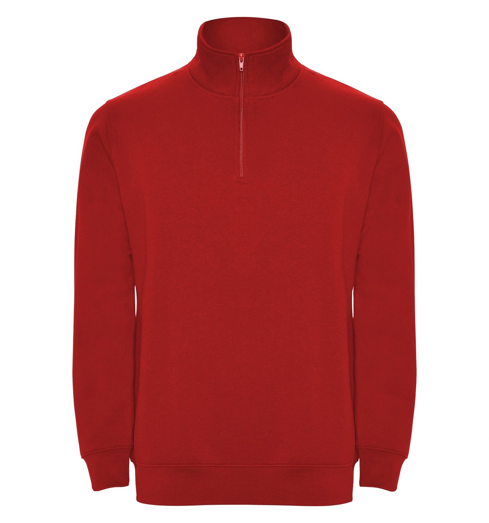 Hanorac cu fermoar la gât de aceeași culoare și guler înalt. Interior guler de aceeași culoare. Bandă întărită pentru acoperirea cusăturii pe interior la guler. Punct în canalé 1x1 la manșete și în talie.