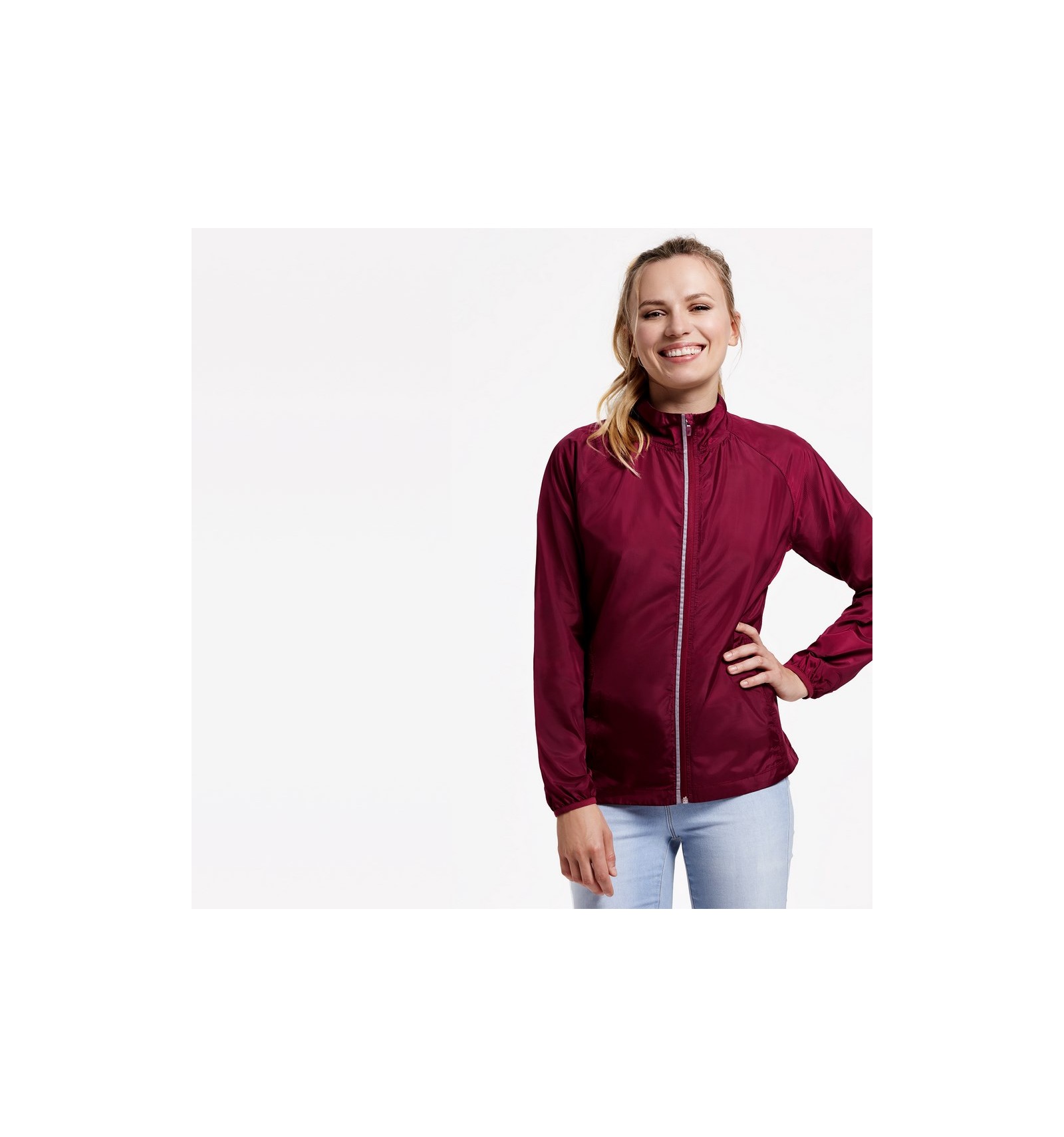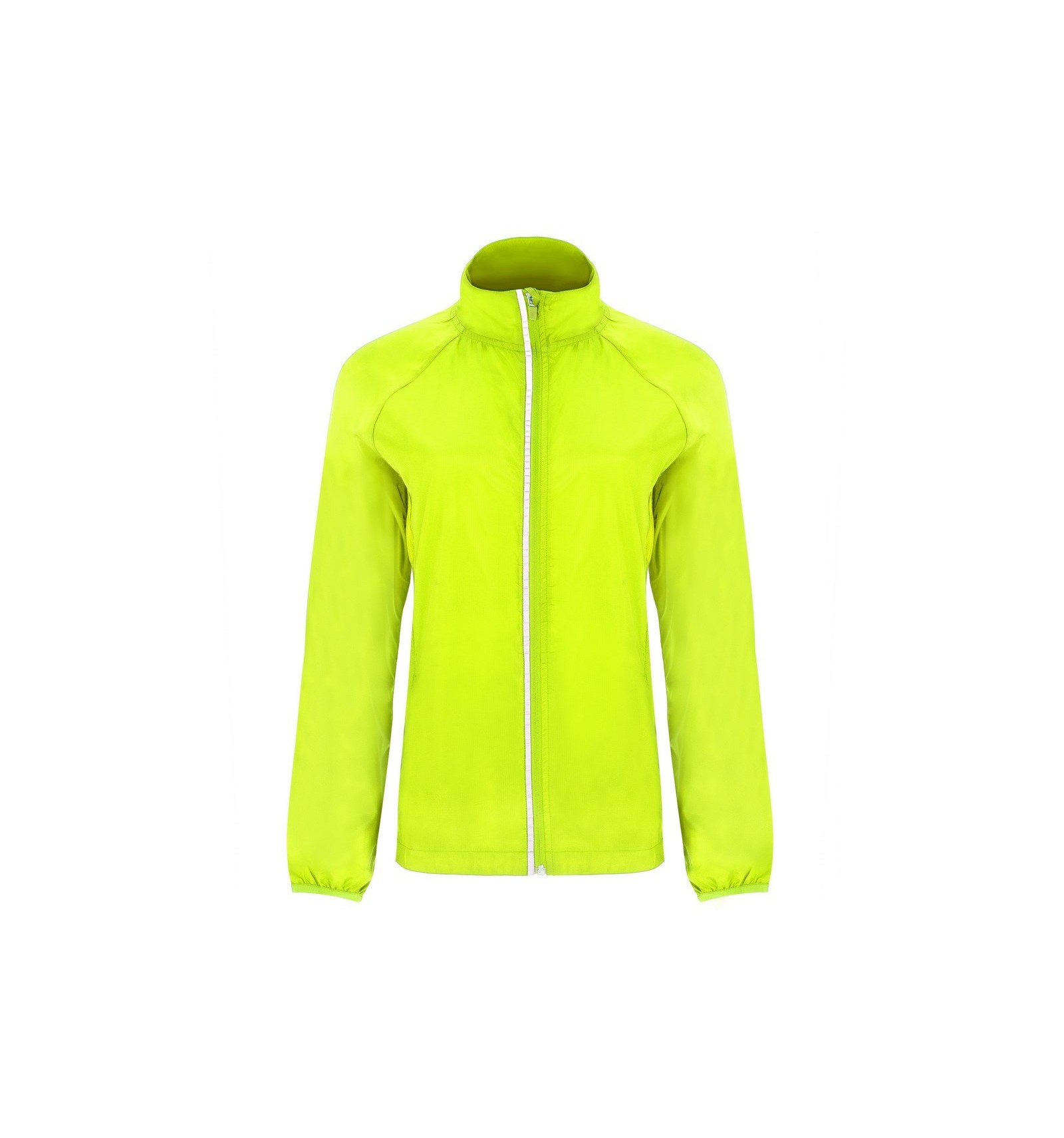 Jachetă anti-vânt din material tehnic lejer: 1. Guler cu material respirabil în interior, cu bandă pentru acoperirea cusăturilor. 2. Fermoar inversat cu elemente reflectorizante, protector pentru bărbie și cheiță. 3. Material respirabil la subraț. 4. Buzunare în față cu fermoar. 5. Buzunar interior pentru a păstra jacheta ca într-un săculeț. 6. Manșete și talie cu elastic. 7. Elemente reflectorizante la spate.