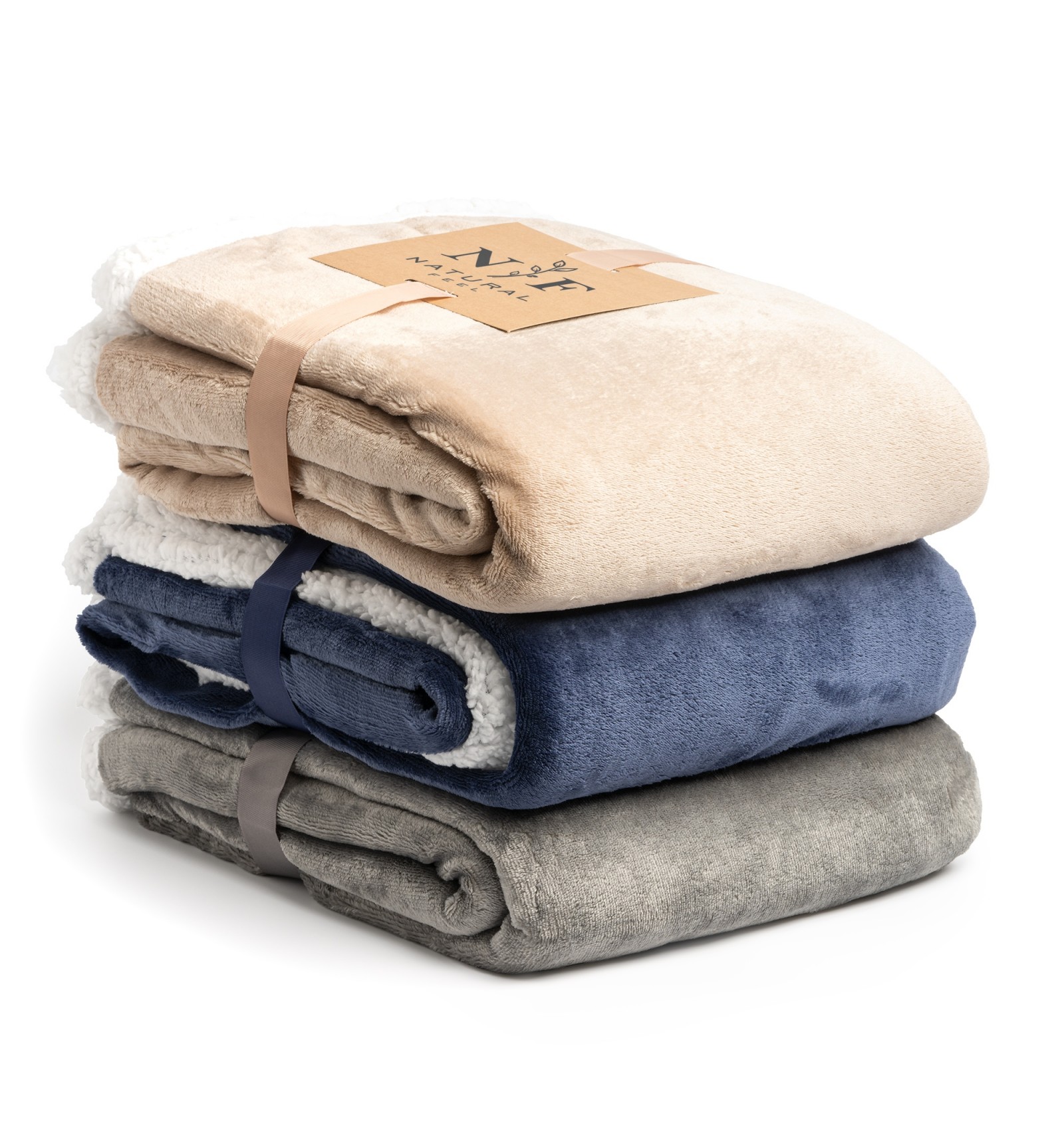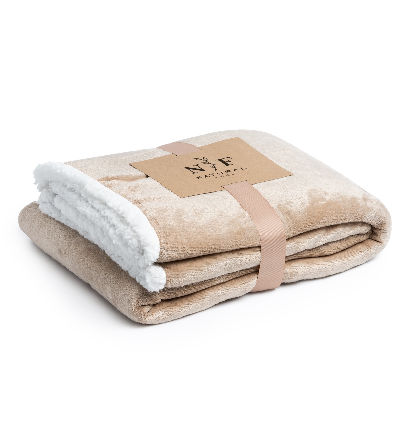 Pătură în stil Sherpa din lână de 380 g/m². Cartonaș ideal pentru imprimare și panglică colorată asortată inclusă.