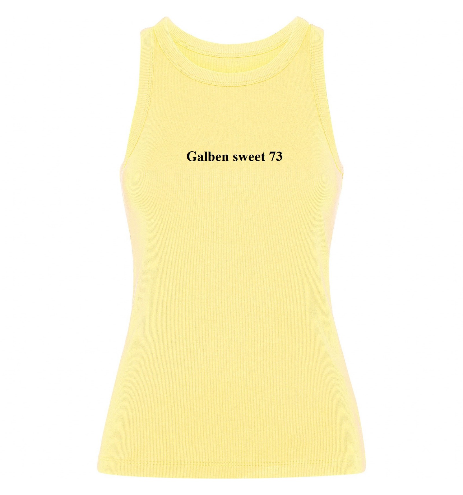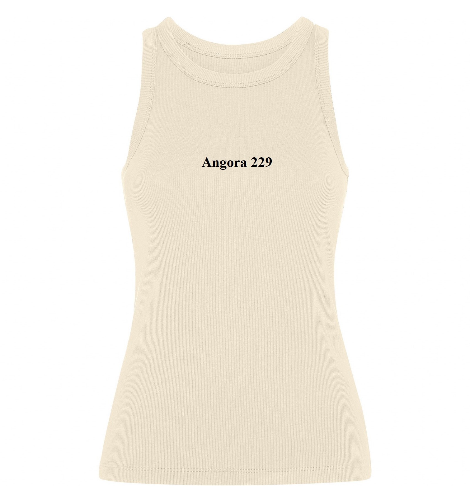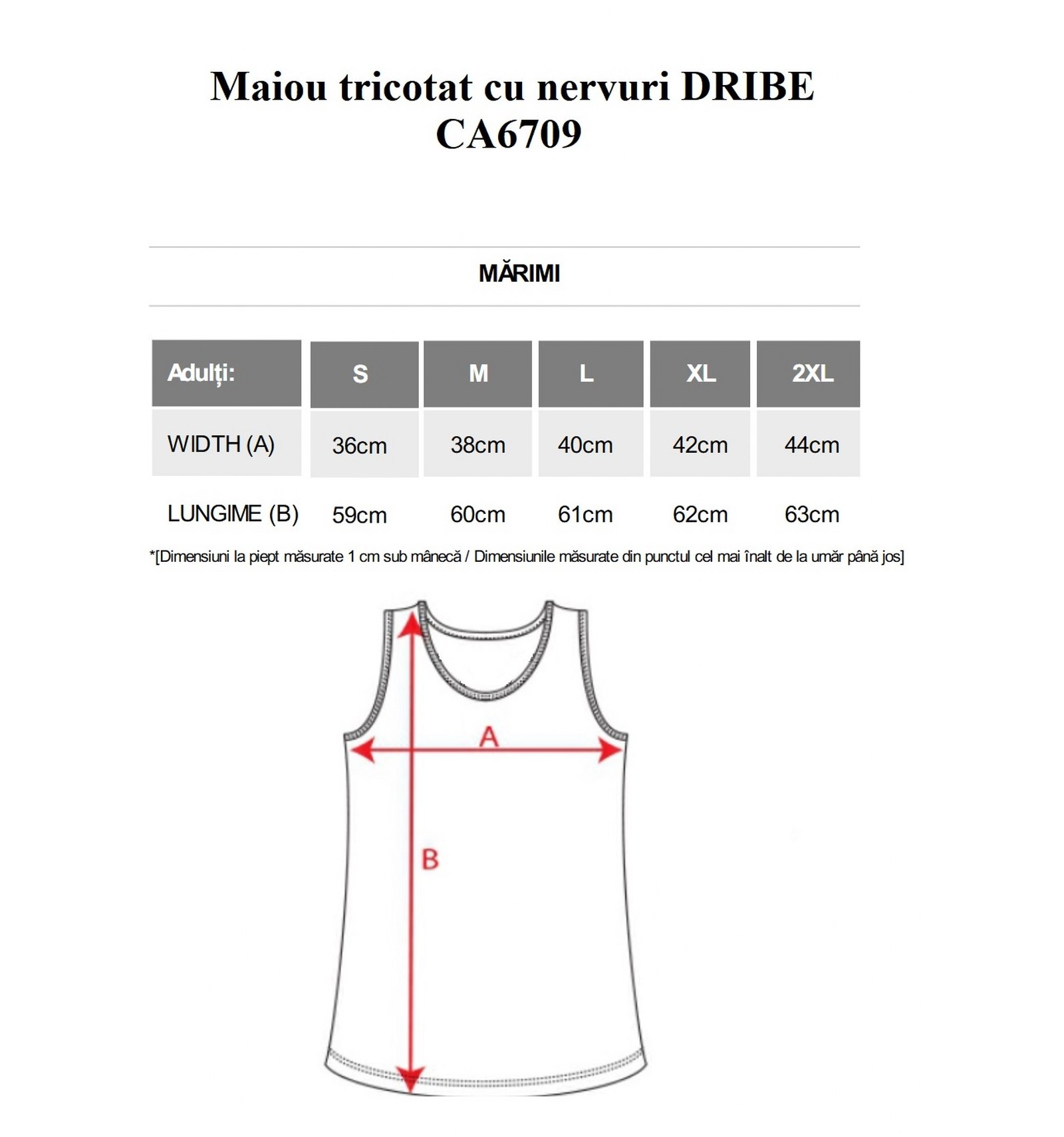 Maiou tricotat cambrat cu nervuri. Guler lat și zonă brațe din același material și întărite cu două cusături. Tiv dublu cusut.