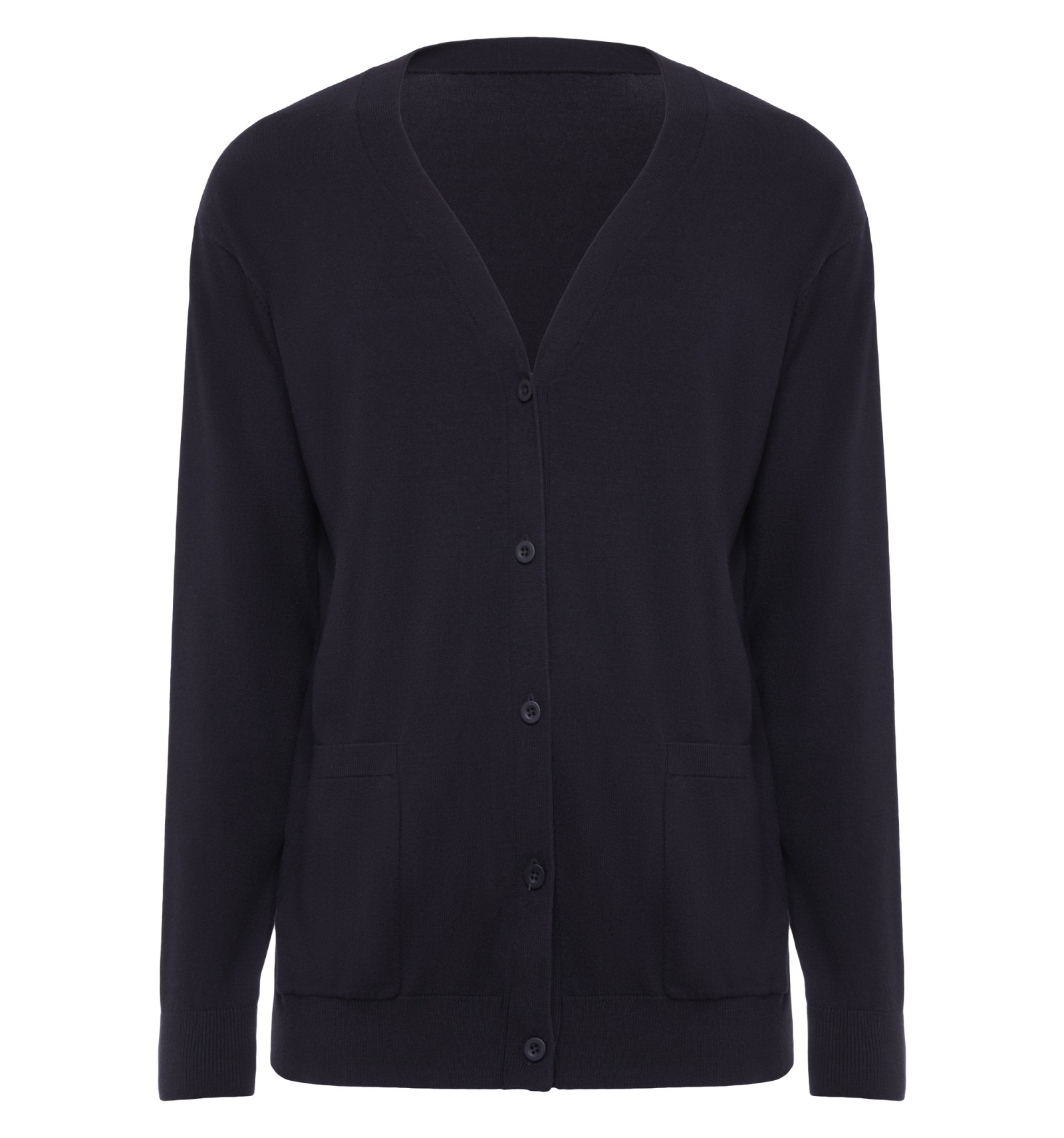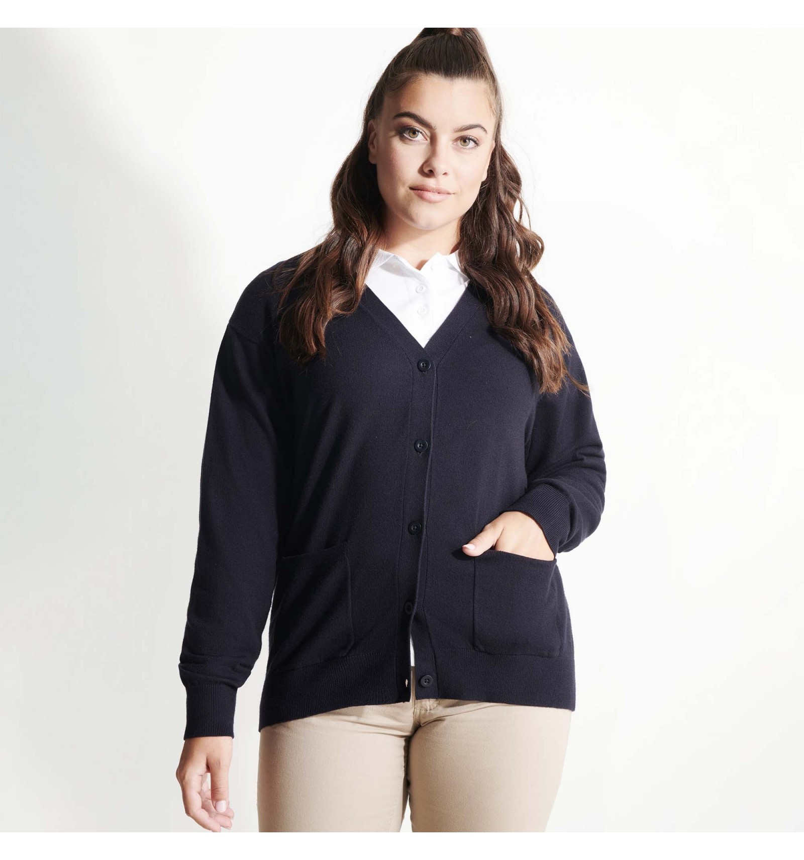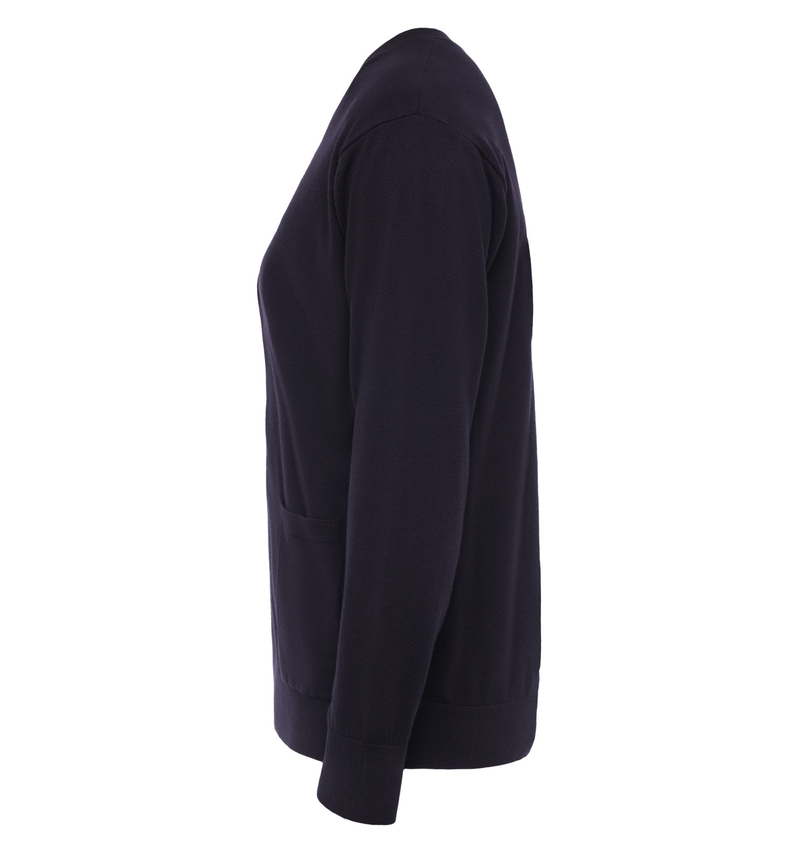 Jacheta cu guler cu anchior. Material de punct fin. Închidere pe mijloc cu cinci nasturi de aceeasi culoare. Doua buzunare aplicate. Talie si mansete în canalé.