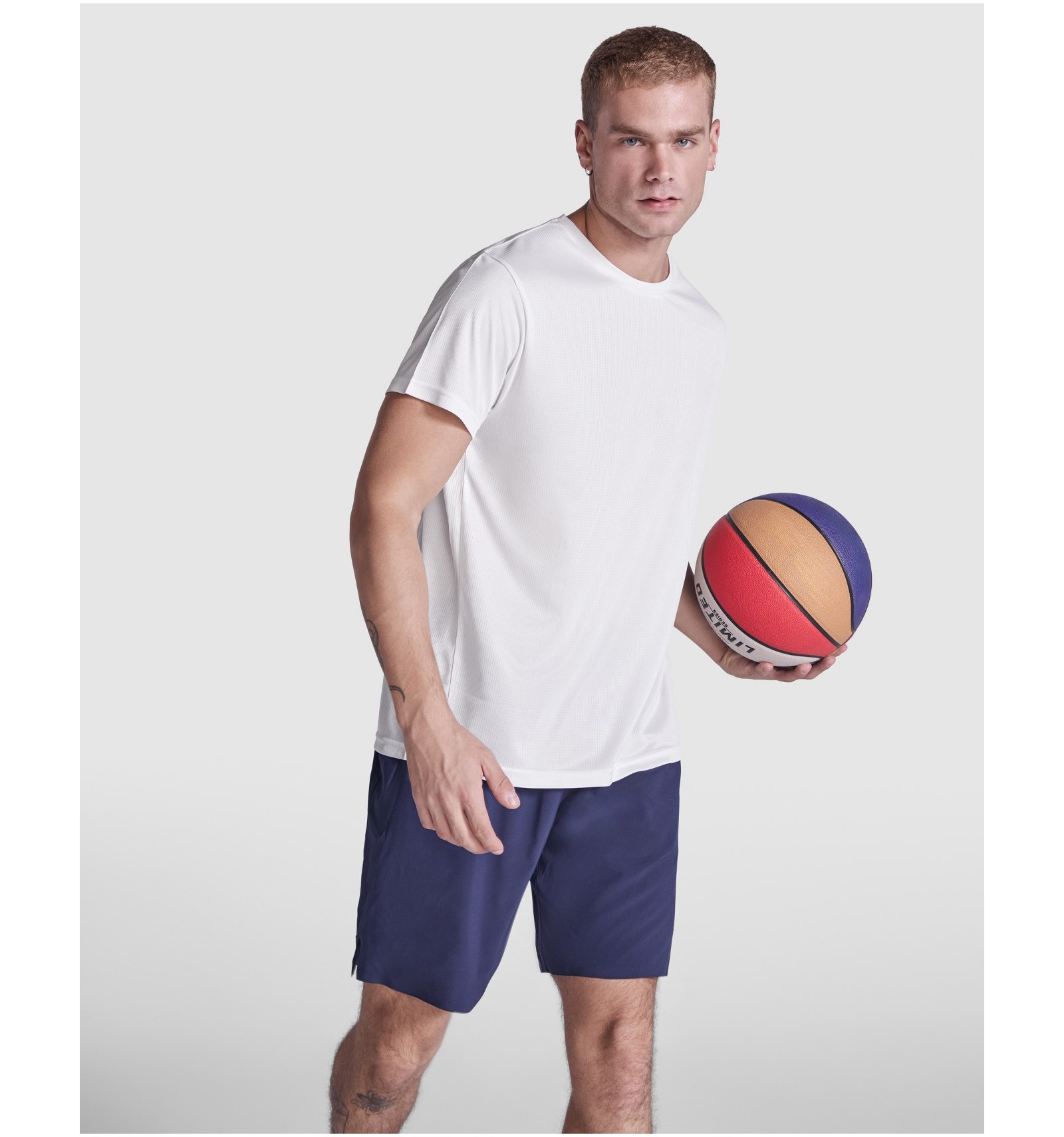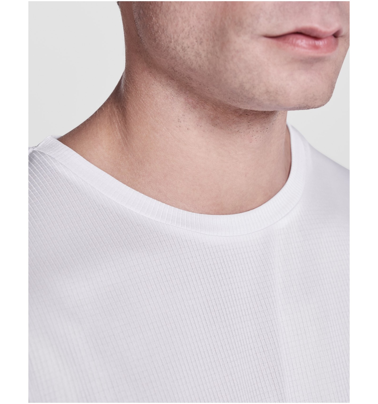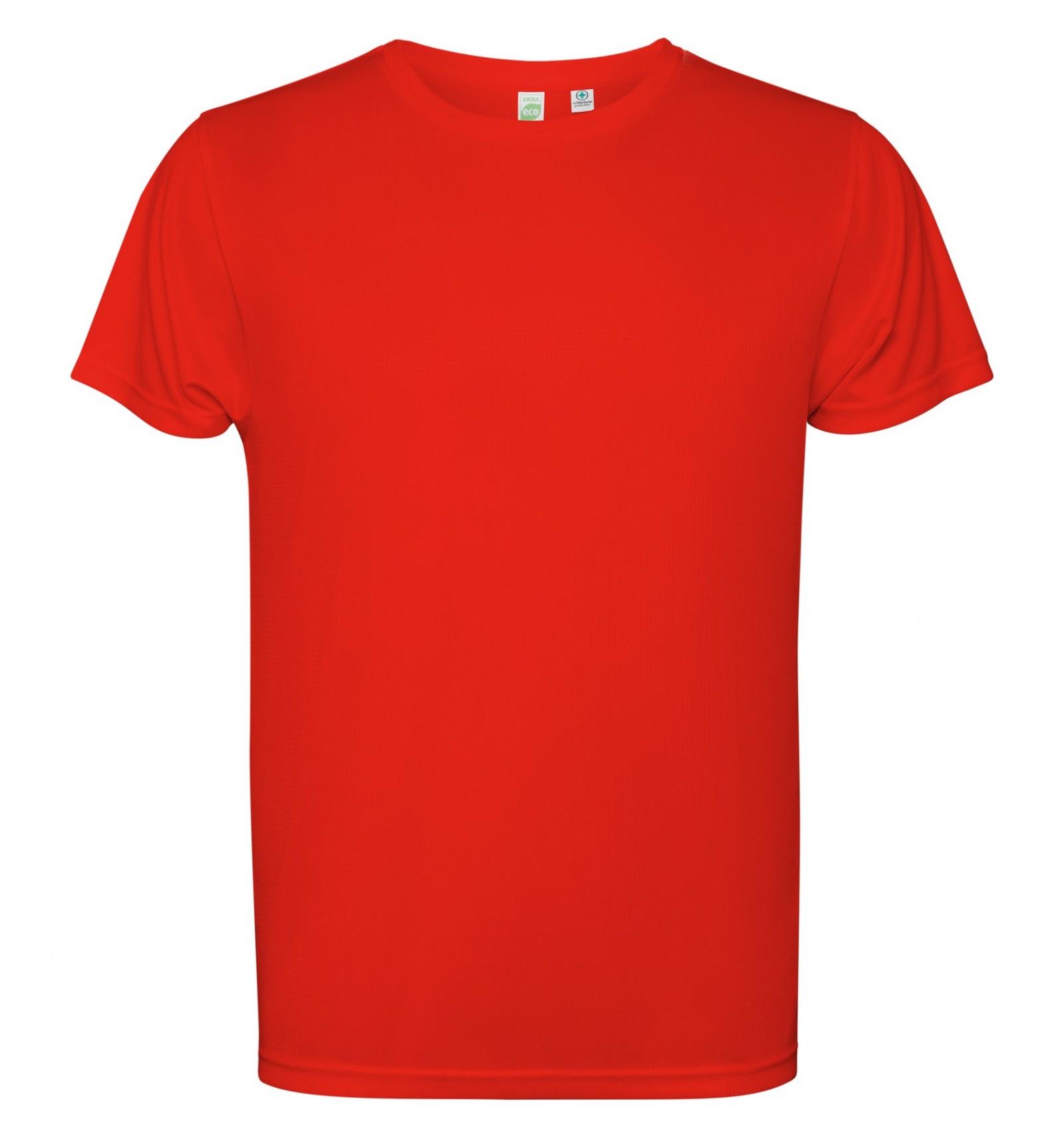 Tricou tehnic cu mânecă scurtă. Guler cu cusături în aceeași culoare.