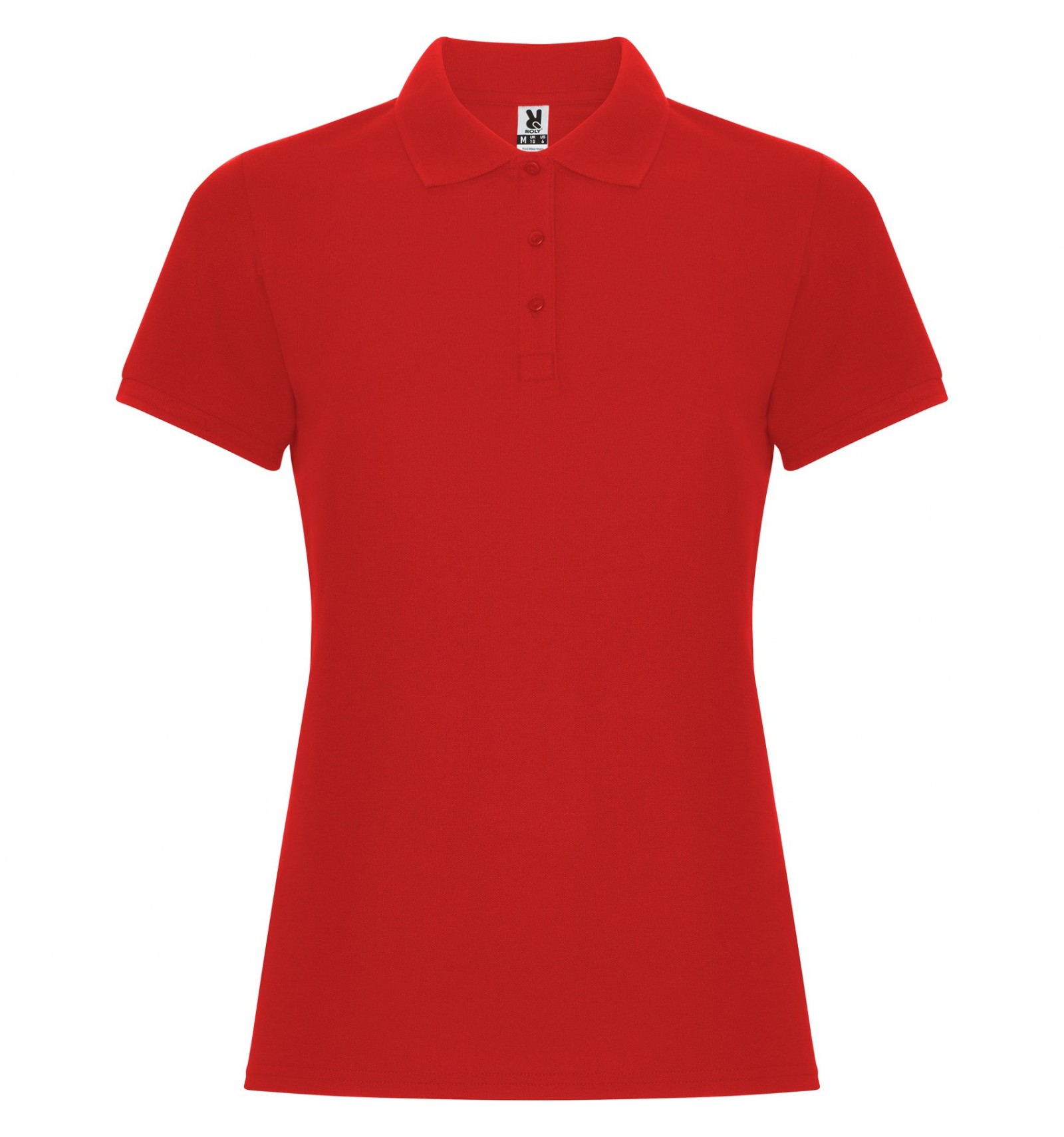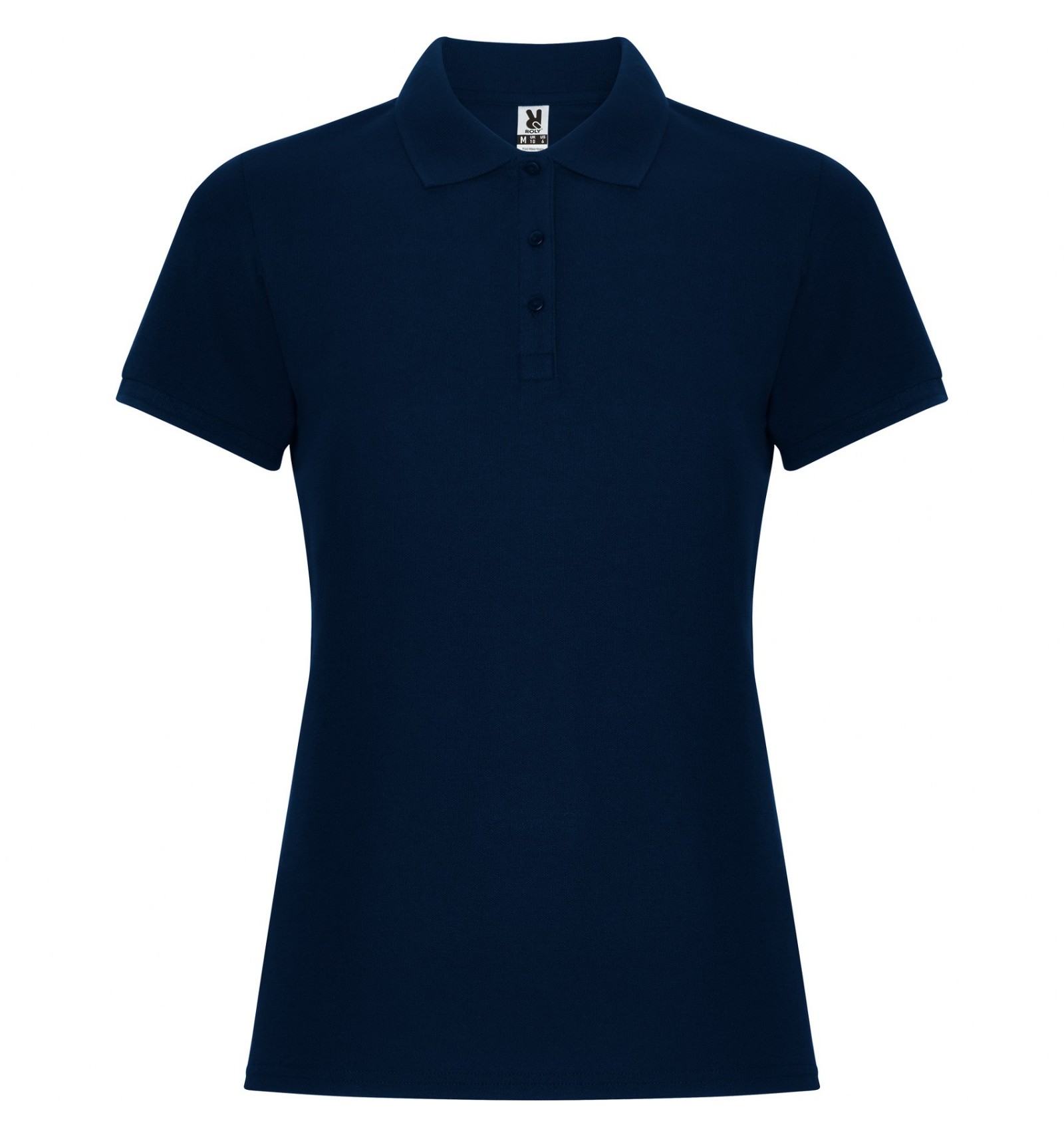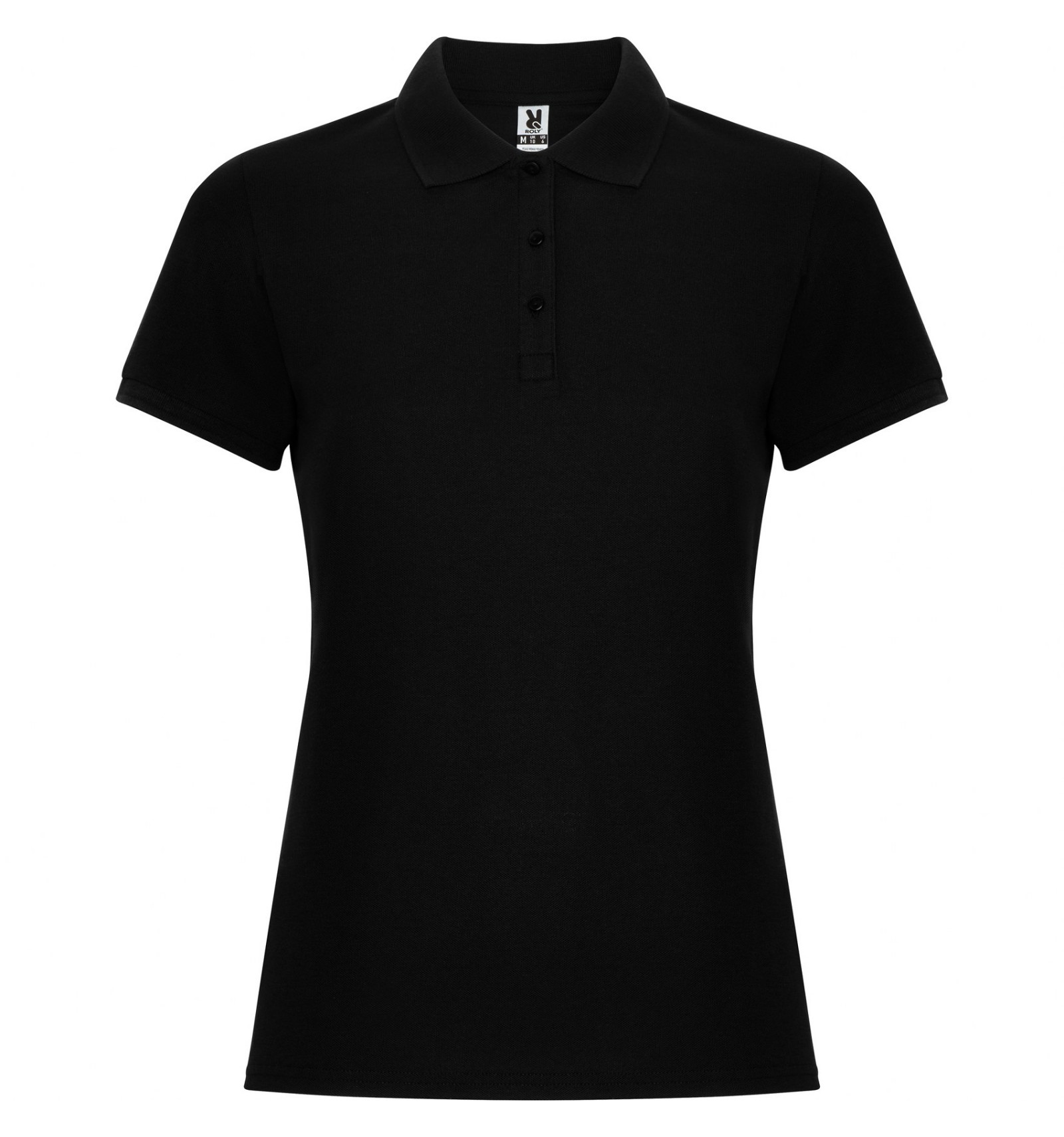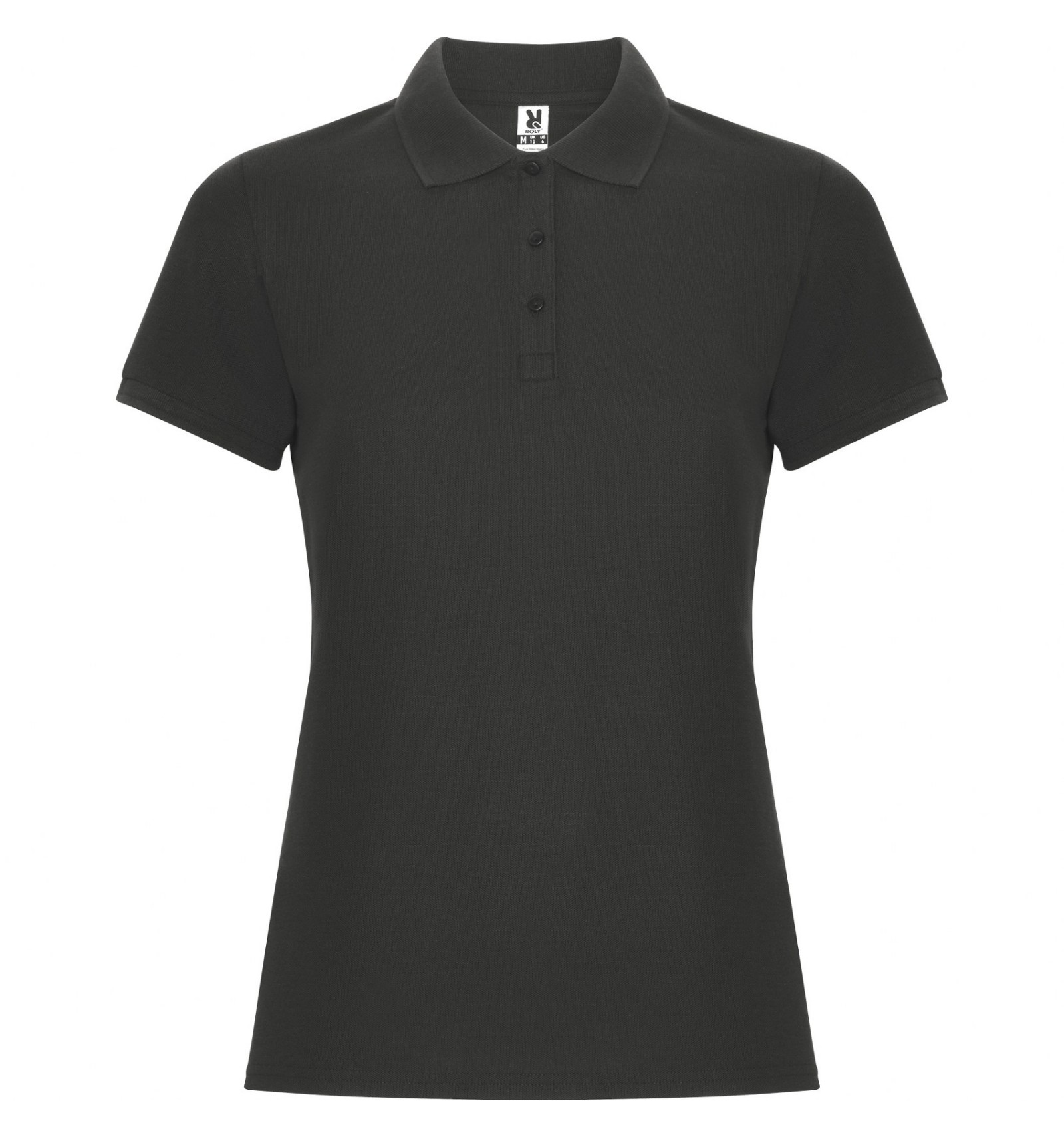 Tricou polo de damă cu mânecă scurtă. Guler și manșete din tricot. Fantă cu 3 nasturi. Bandă întărită pentru acoperirea cusăturii la guler și șlițuri laterale.