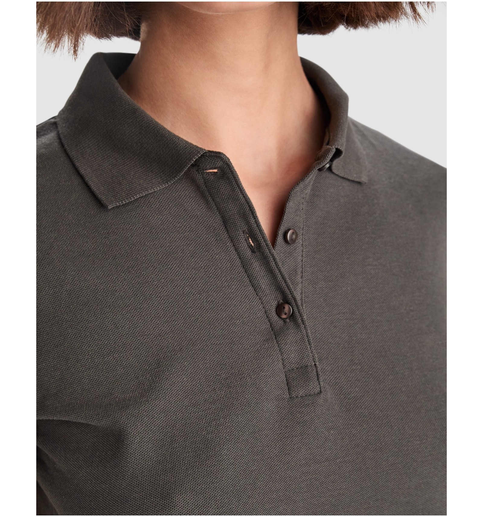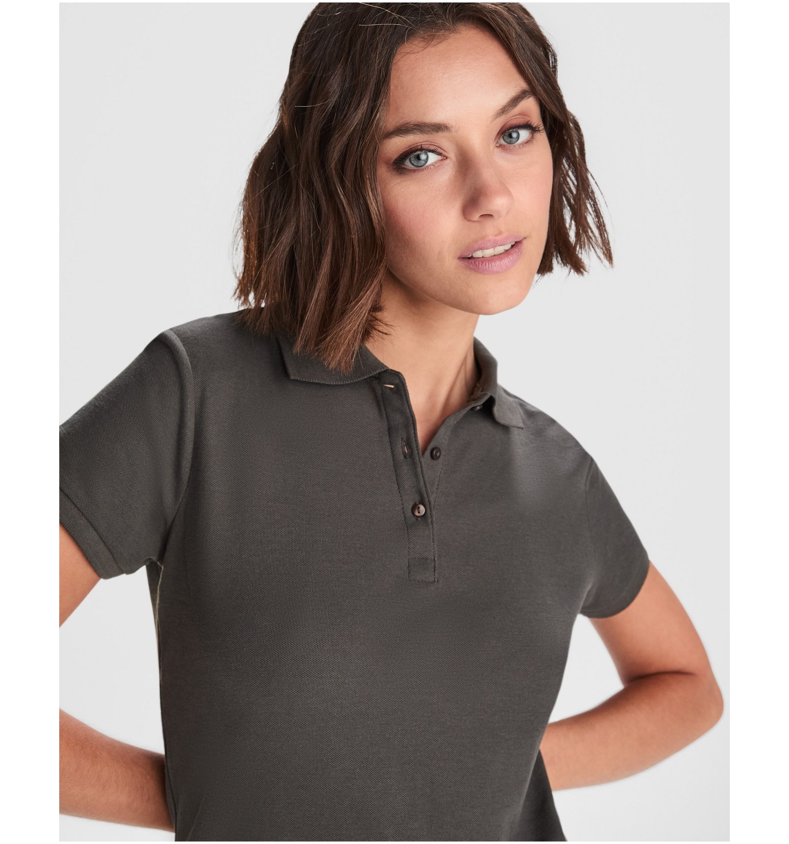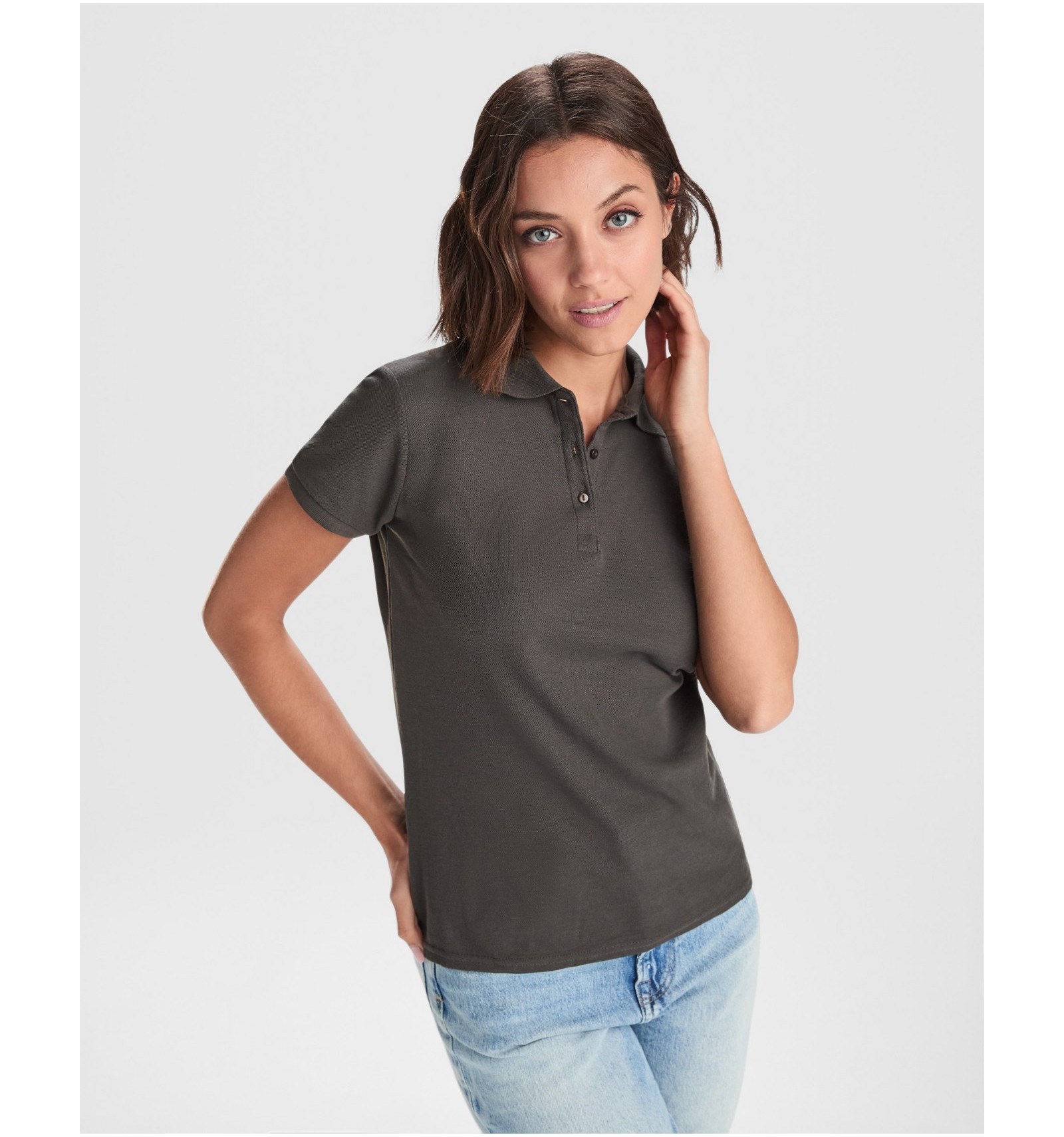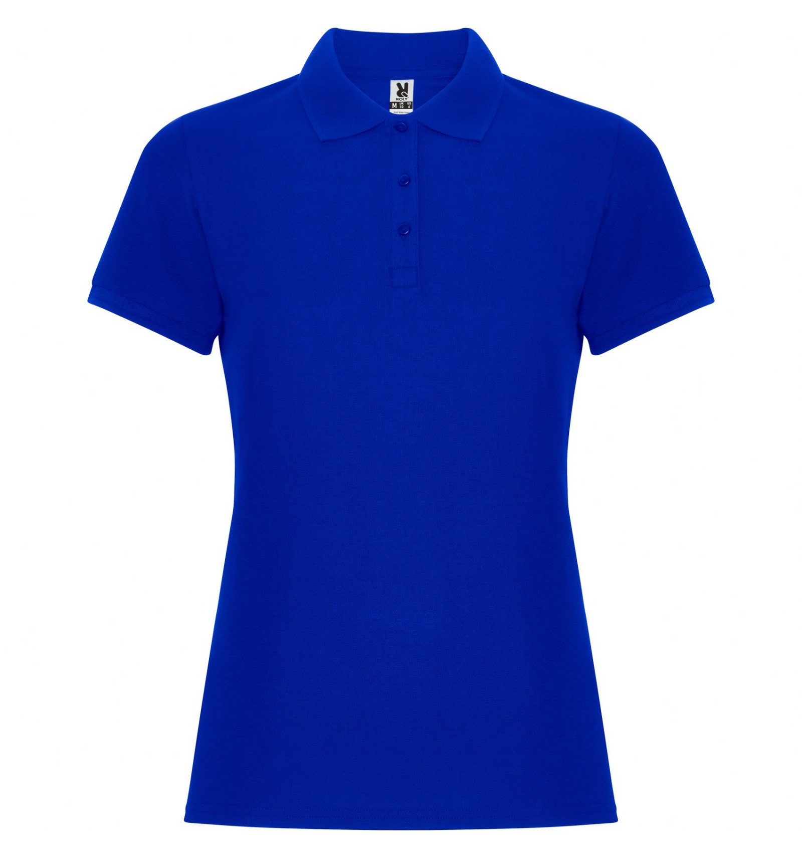 Tricou polo de damă cu mânecă scurtă. Guler și manșete din tricot. Fantă cu 3 nasturi. Bandă întărită pentru acoperirea cusăturii la guler și șlițuri laterale.