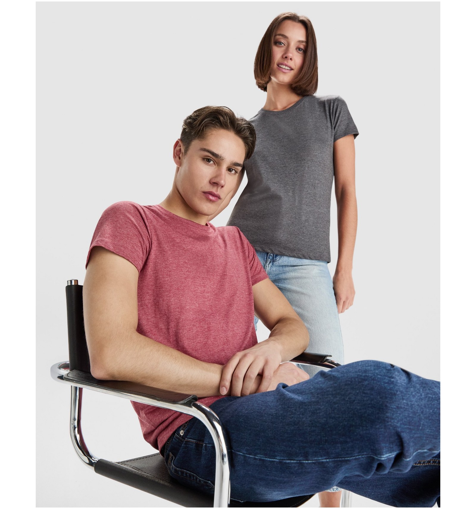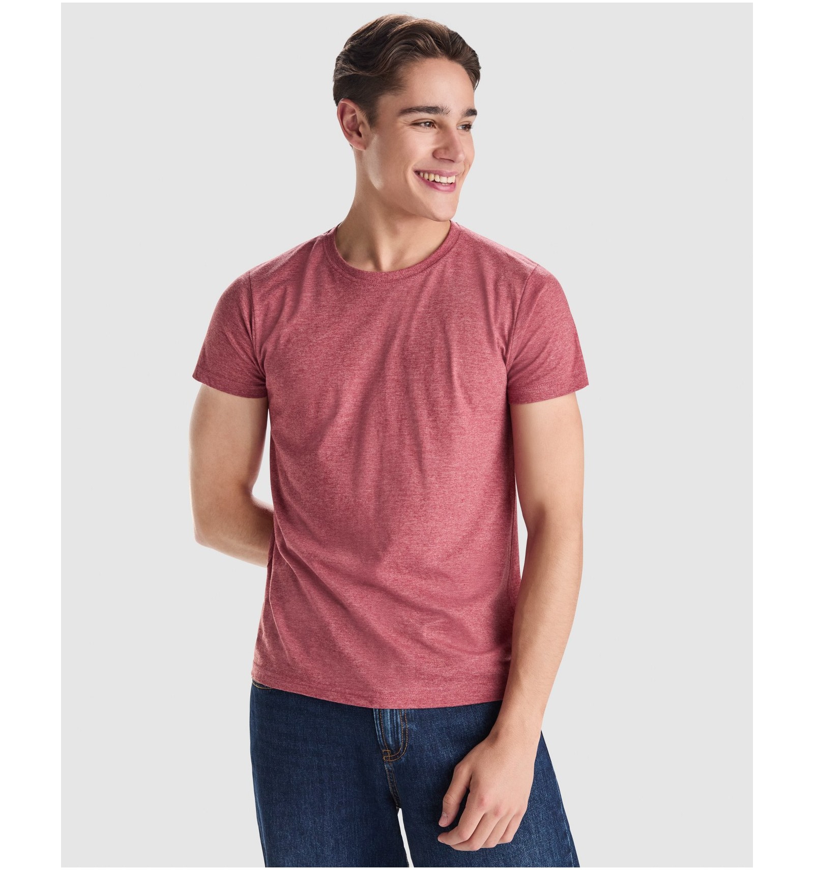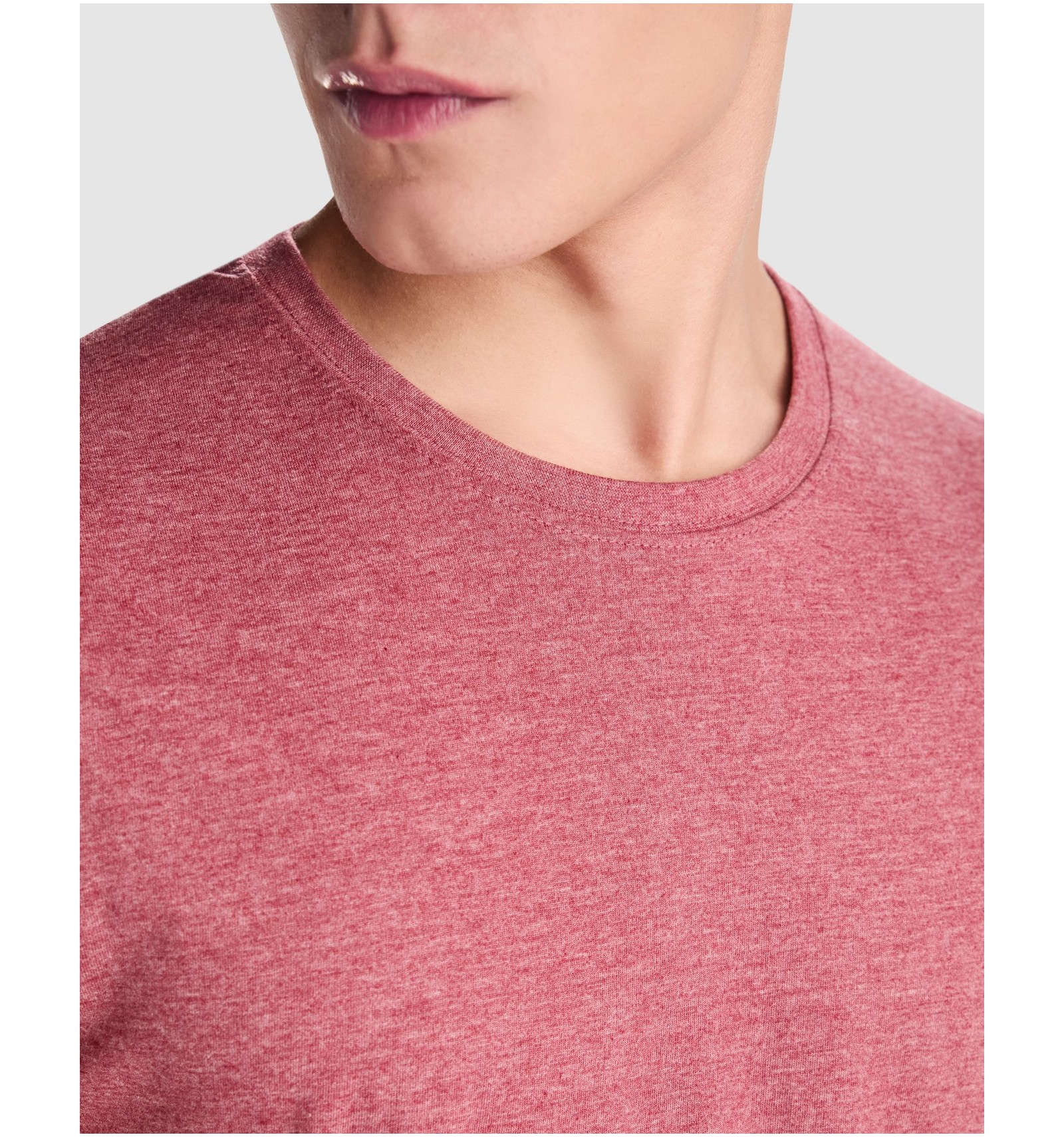 Tricou cu mânecă scurtă, în culori melanj. Guler rotund în punct canalé 1x1 cu bandă întărită pentru acoperirea cusăturilor. Fără cusături laterale.