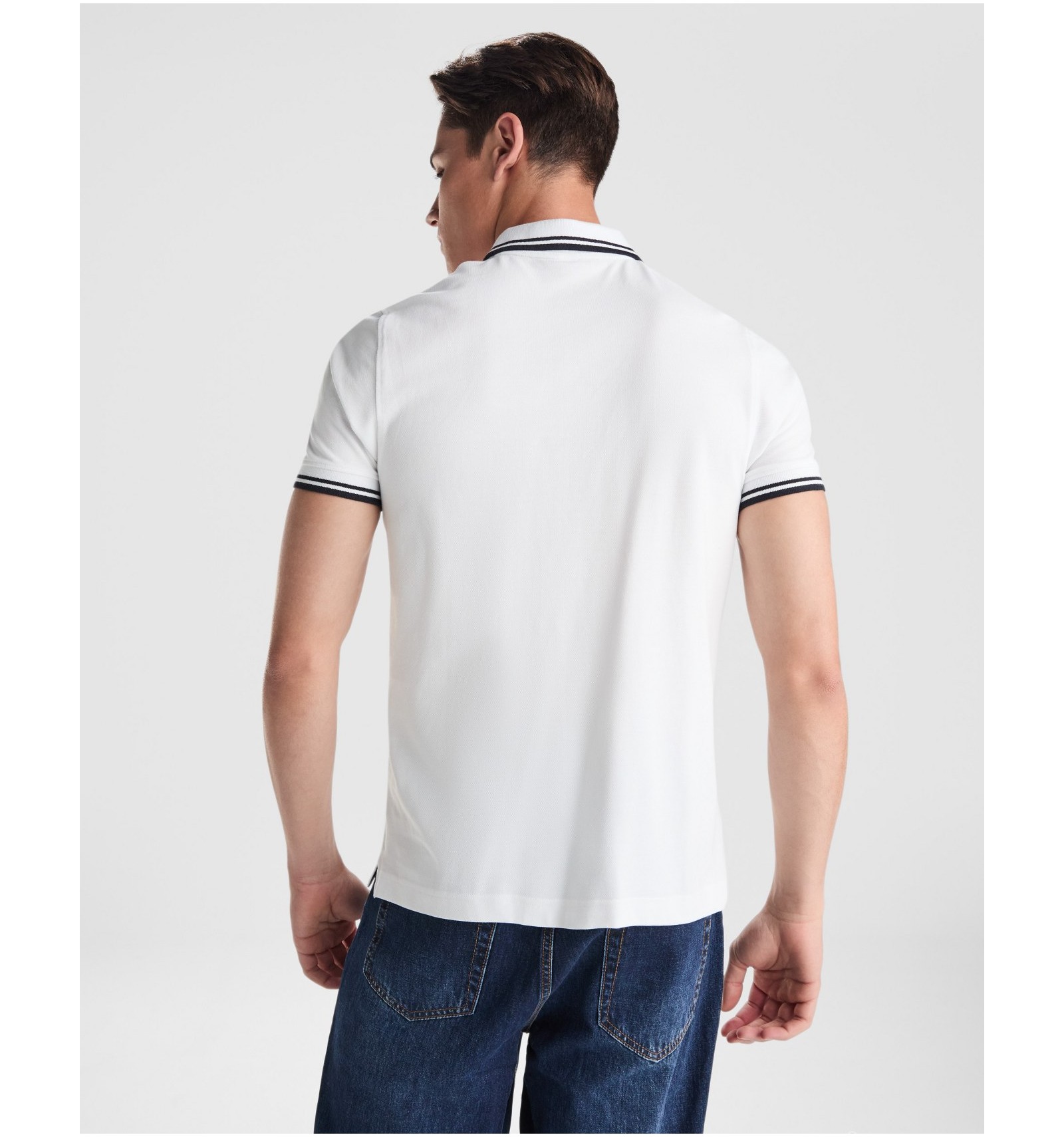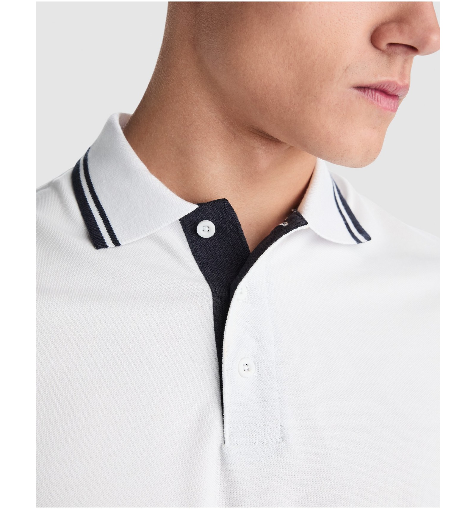Tricou polo cu mânecă scurtă, guler cu fantă de 3 nasturi de aceeași culoare. Fantă interioară în contrast cu cea exterioară. Guler și manșete canelate, bandă întărită pentru acoperirea cusăturii la guler. Șlițuri laterale.