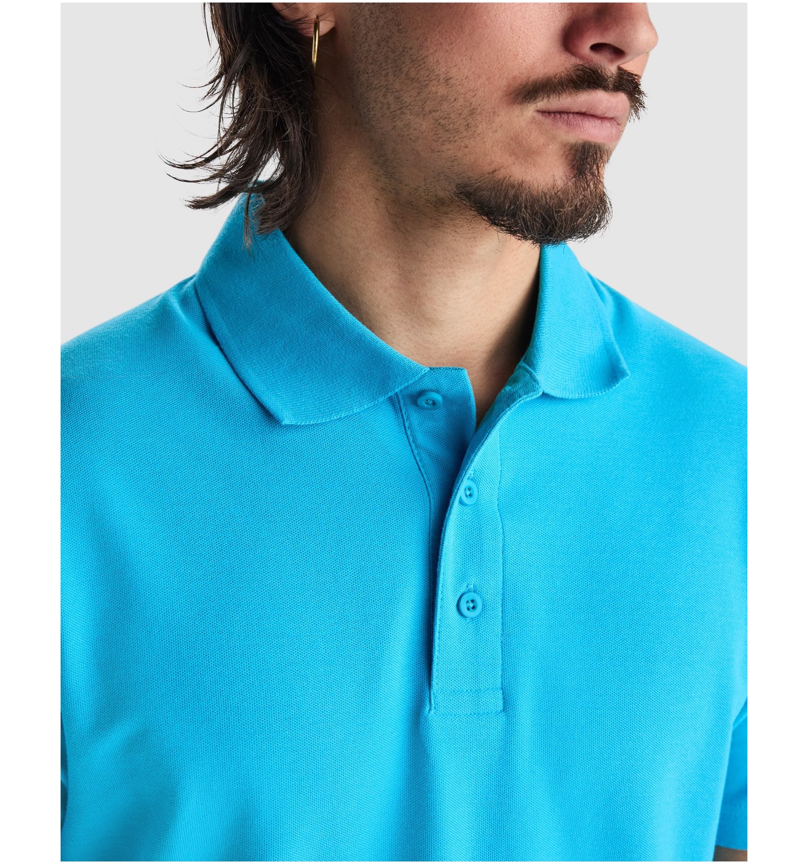 Tricou polo cu mânecă scurtă, guler canelat și fantă cu 3 nasturi. Bandă întărită pentru acoperirea cusăturii la guler.